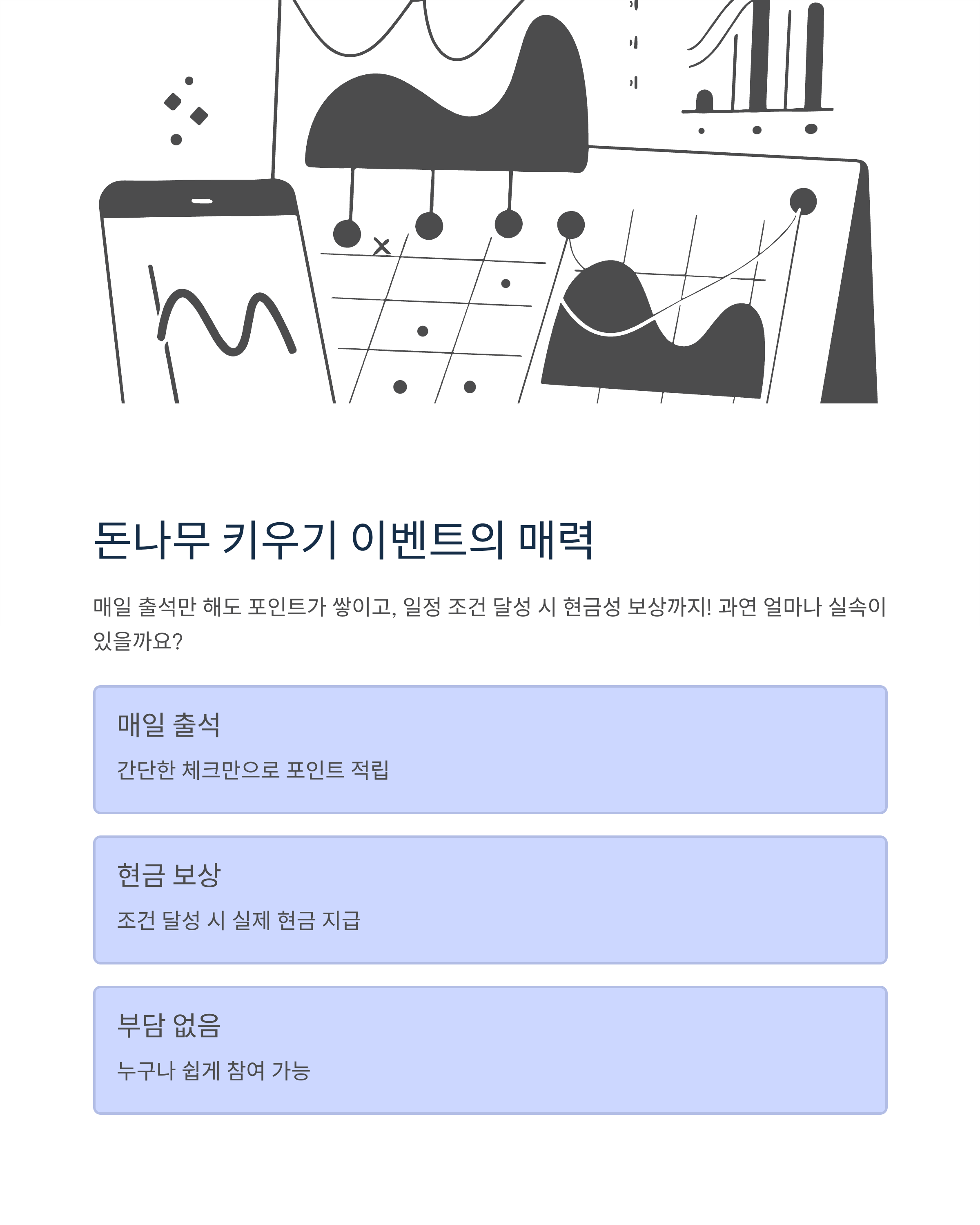 "돈나무 키우기만으로 10만 원 받았다"는 후기도 적지 않지만, 실제로는 일정 조건을 만족해야 하는 구조입니다. 보상을 받기 위해서는 단순한 출석 외에도 앱테크 활동이 함께 이뤄져야 해요.