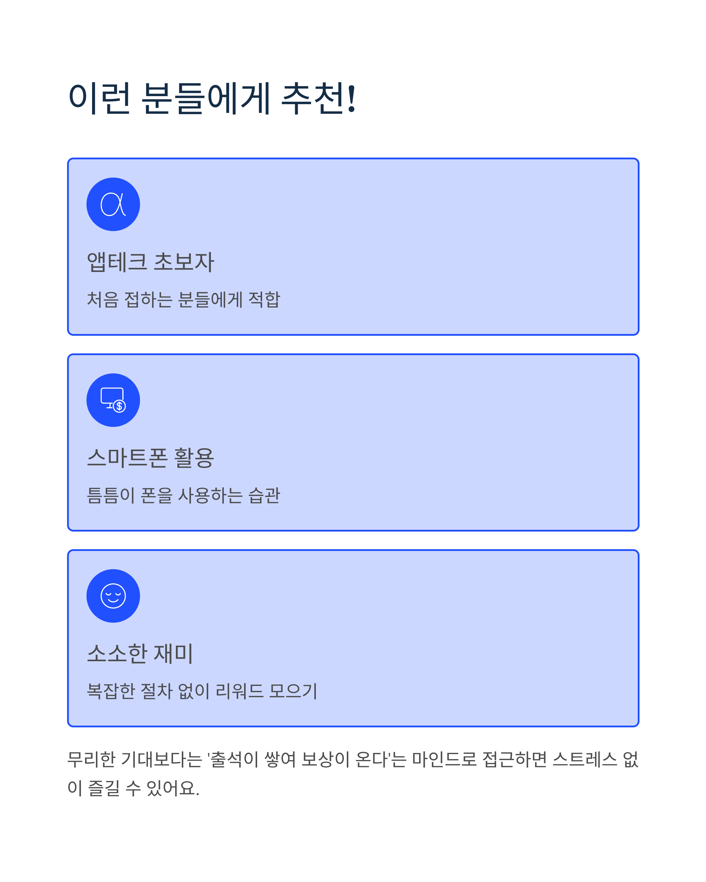 앱테크를 처음 접하는 분들이나, 틈틈이 스마트폰을 사용하는 습관이 있는 분들에게 적합합니다. 복잡한 절차 없이 소소한 리워드를 모으는 재미를 느끼고 싶다면 한 번쯤 도전해 볼 만한 이벤트죠.