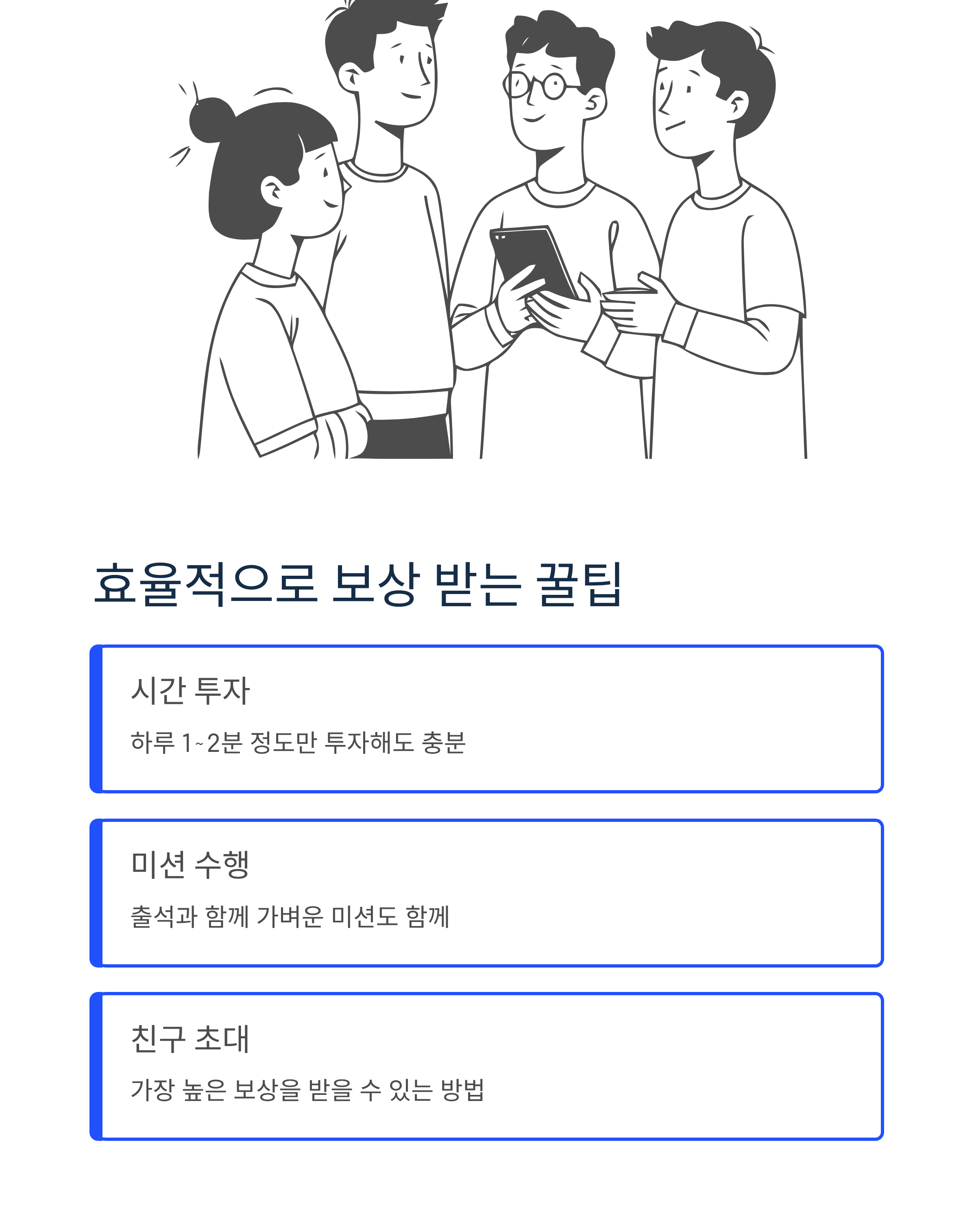 하루 1~2분 정도의 시간을 투자해 출석 체크는 물론, 가볍게 미션을 수행하는 것도 좋은 전략입니다.
