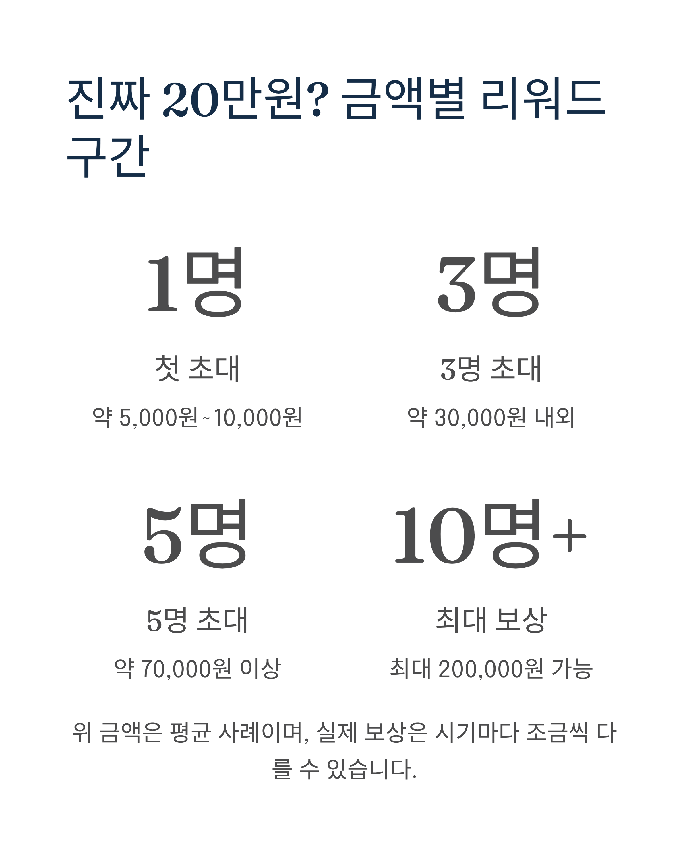 이벤트 구조상, 초대한 친구가 많을수록 리워드는 커집니다. 최대 10명 이상 초대하면 누적 리워드가 20만원 이상이 될 수 있어요.