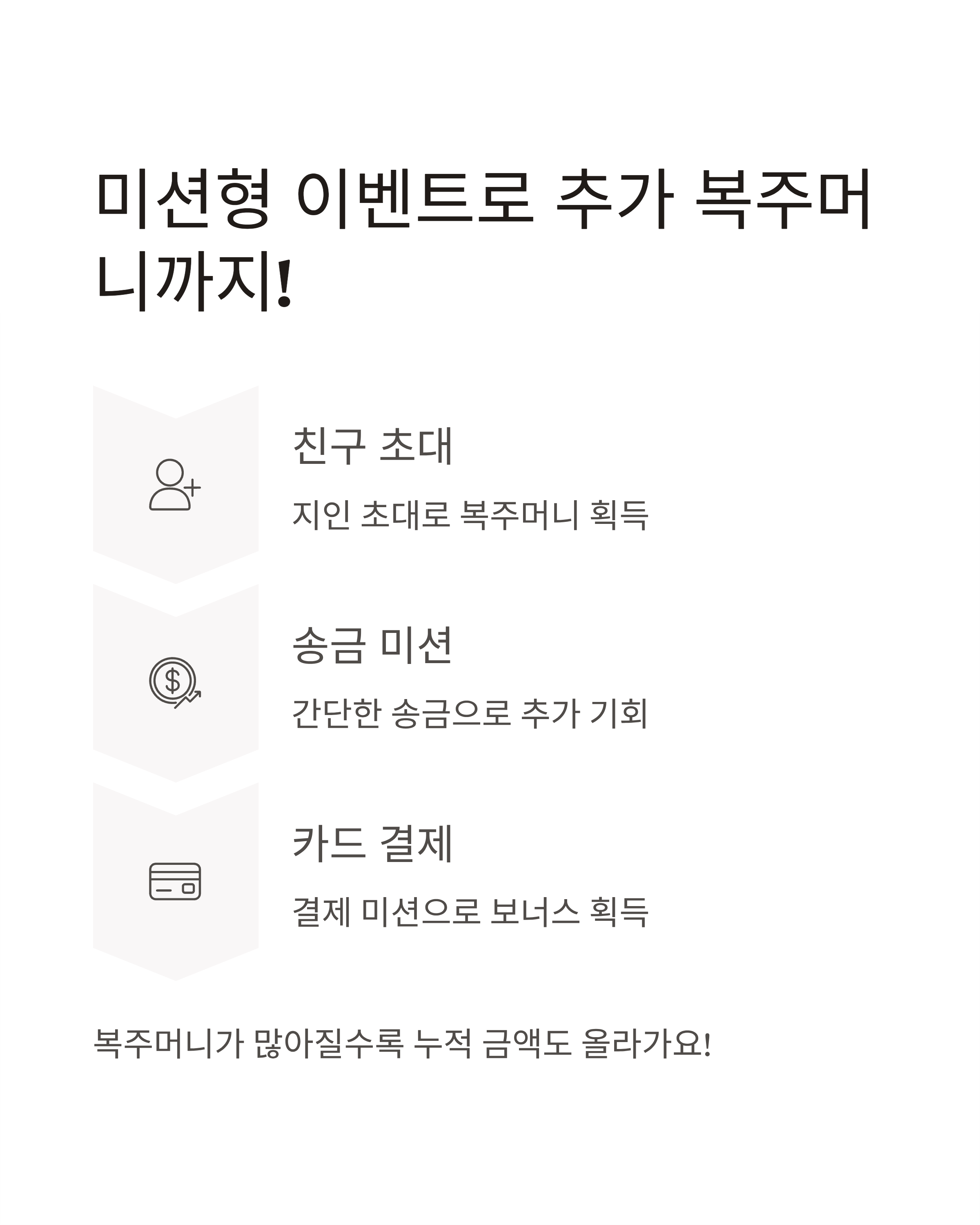 친구 초대, 송금, 카드 결제 등 간단한 미션을 완료하면 복주머니가 하나씩 더 열립니다. 복주머니가 많아질수록 누적 금액도 올라가고, 간혹 보너스 이벤트로 당첨 확률도 올라가는 날이 있으니 이벤트 페이지를 자주 확인하는 게 좋아요.